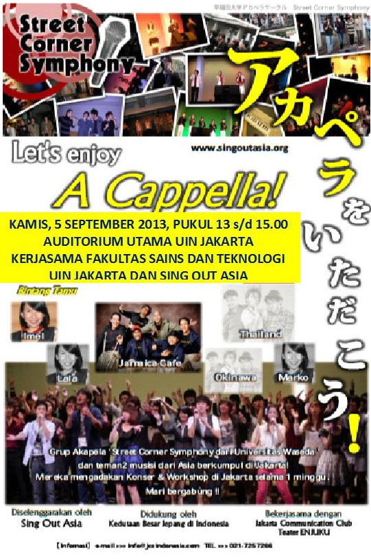 Konser Acapella Sing Out Asia bertempat Auditorium Utama Uin Jakarta 05 September 2013 Pukul 13.00 s.d 15.00 WIB. Kerjasama Fakultas Sains Dan Teknologi UIN Jakarta Dan Sing Out Asia dan dimeriahkan Ten to Five dihadiri dan disambut meriah oleh mahasiswa/i UIN Syarif Hidayatullah Jakarta.