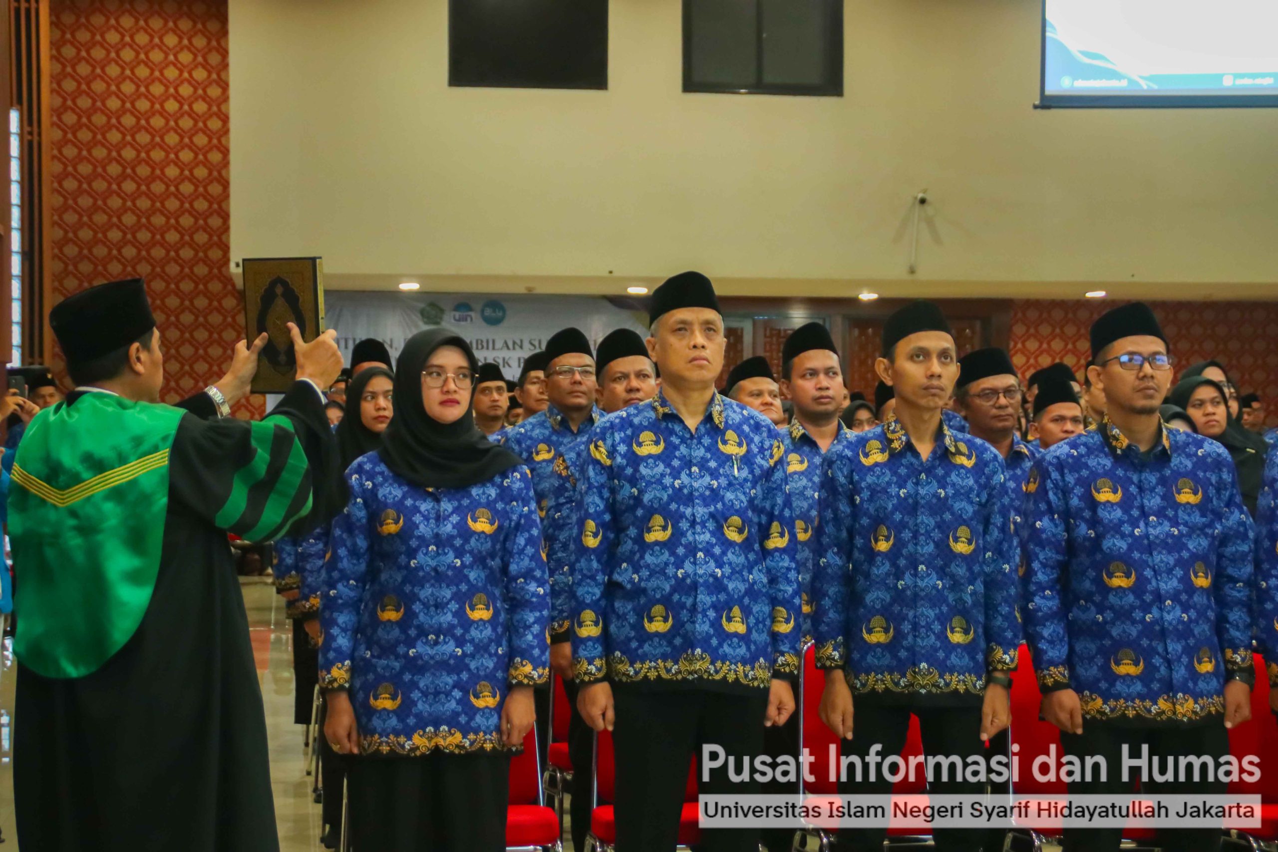 Sejumlah 178 Pegawai Pemerintah dengan Perjanjian Kerja (PPPK) Tahap I Formasi Tahun 2024 di lingkungan UIN syarif Hidayatullah Jakarta resmi dilantik. Senin (26/5/2025), bertempat di Auditorium Prof. Dr. Bahtiar Effendy Fakultas Ilmu Sosial dan Ilmu Politik UIN Syarif Hidayatullah Jakarta, acara pelantikan digelar dan berlangsung secara khidmat. Acara pelantikan dihadiri oleh sejumlah pimpinan di lingkungan UIN Syarif Hidayatullah Jakarta, mulai dari Rektor, Para Wakil Rektor, Para Kepala Biro, Para Dekan, Direktur Pascasarjana, Para Ketua Lembaga, Kepala SPI, Para Kepala Bagian, Para Kepala Sub Bagian dan Para Ketua Tim Kerja.