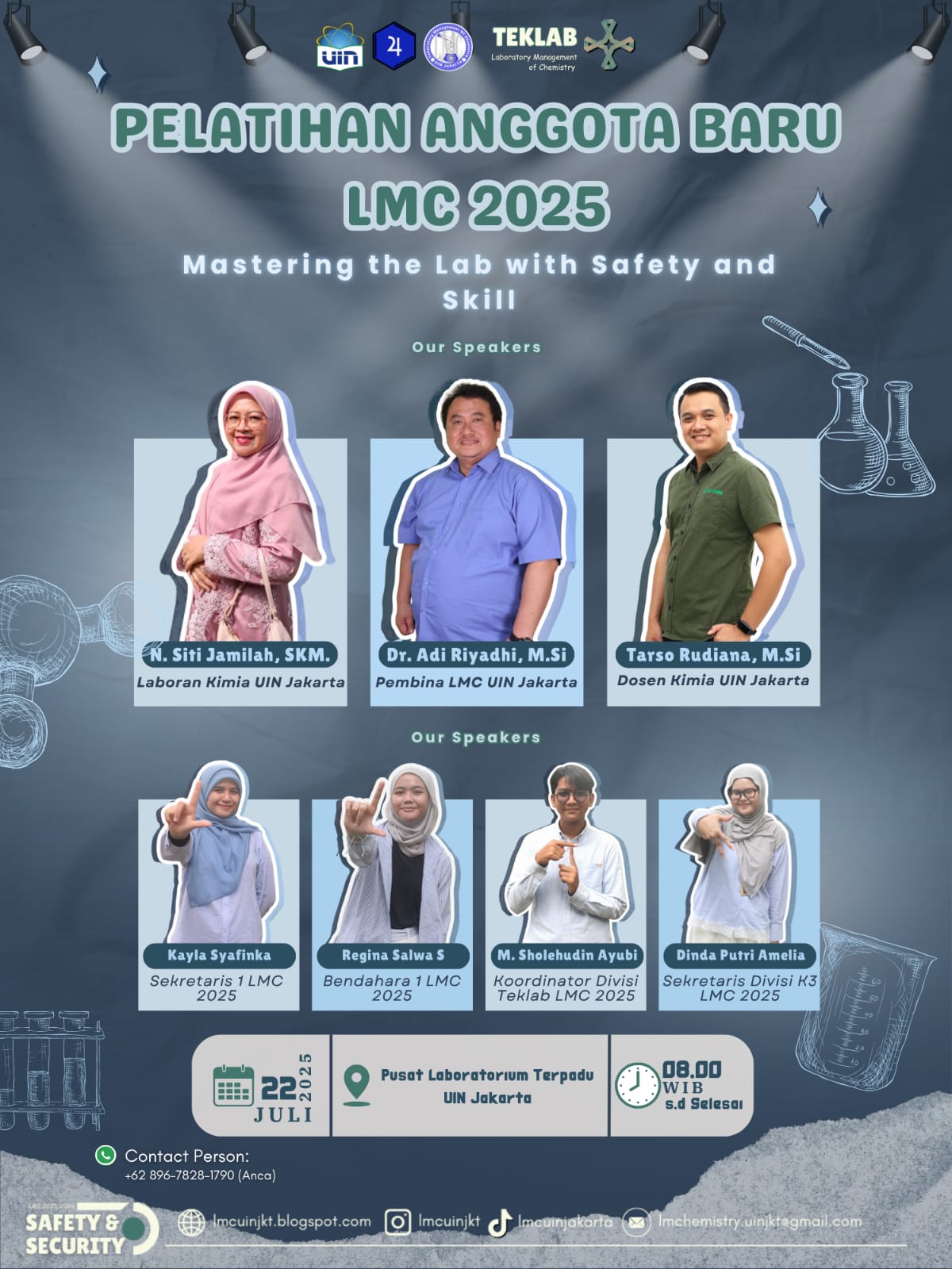 Laboratorium Kimia (LMC) UIN Jakarta mengadakan kegiatan pengenalan laboratorium kepada anggota baru di tahun 2025 Kegiatan ini bertujuan untuk membekali anggota baru dengan pengetahuan dan keterampilan yang diperlukan untuk beraktivitas di laboratorium. Informasi lebih detail mengenai kegiatan ini, seperti tanggal pasti, rundown acara, dan materi yang akan disampaikan, biasanya akan diumumkan lebih lanjut oleh LMC UIN Jakarta. Untuk mendapatkan informasi terbaru, disarankan untuk memantau pengumuman resmi dari LMC UIN Jakarta, misalnya melalui situs web atau media sosial mereka. Sebagai contoh, pada tahun sebelumnya, LMC UIN Jakarta pernah menyelenggarakan "Pelatihan Anggota Baru LMC" yang diselenggarakan di Gedung Pusat Laboratorium Terpadu. Pelatihan tersebut berlangsung selama satu hari, pada tanggal 22 Juli 2025 dengan beberapa materi yang akan disampaikan oleh para narasumber.